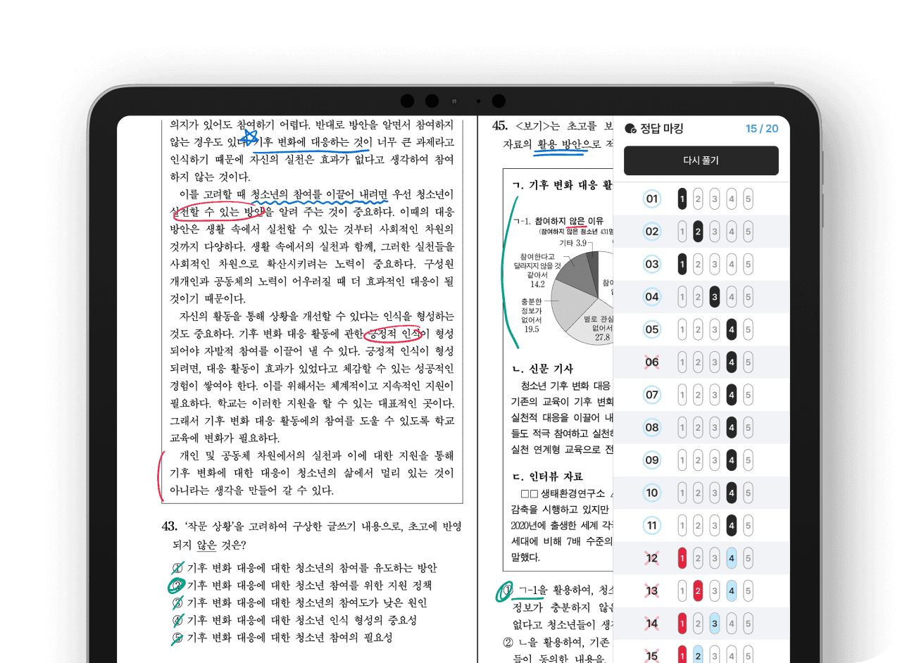 OMR 형식으로 풀고, 자동 채점과 오답 정리까지 돼요